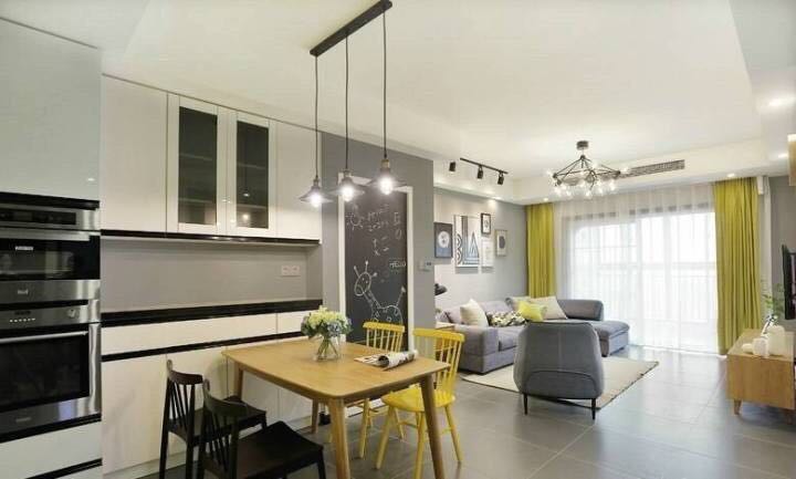 可以把兩個(gè)本來相對獨(dú)立的空間——廚房和客廳連接起來,使得兩個(gè)空間的裝修風(fēng)格相融合,進(jìn)而整個(gè)家的裝修風(fēng)格可以統(tǒng)一、協(xié)調(diào)。因?yàn)樯倭烁魯?,客廳內(nèi)的亮度變大了,更通透,陽光更充足。